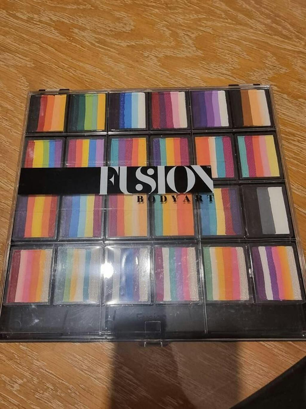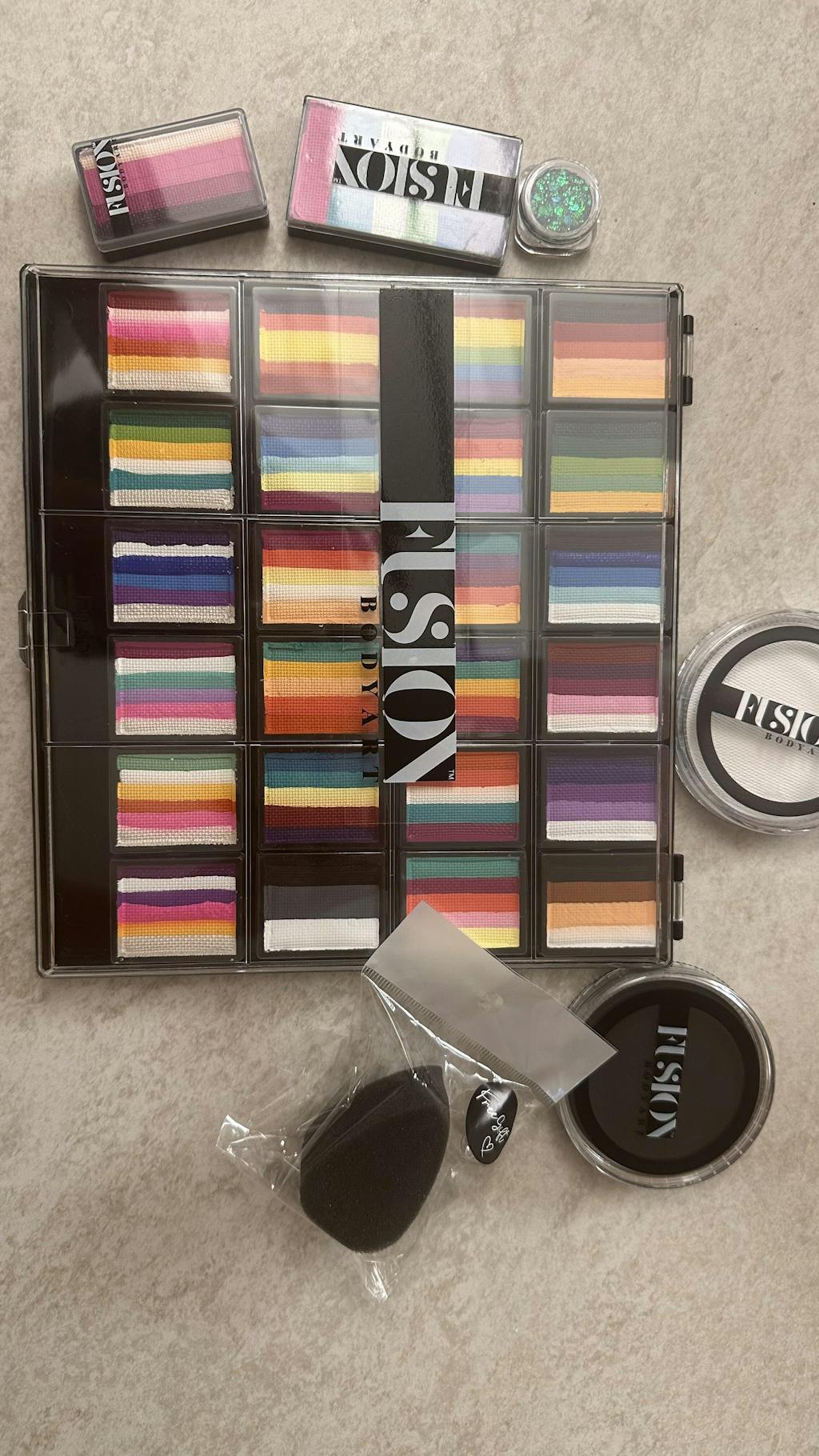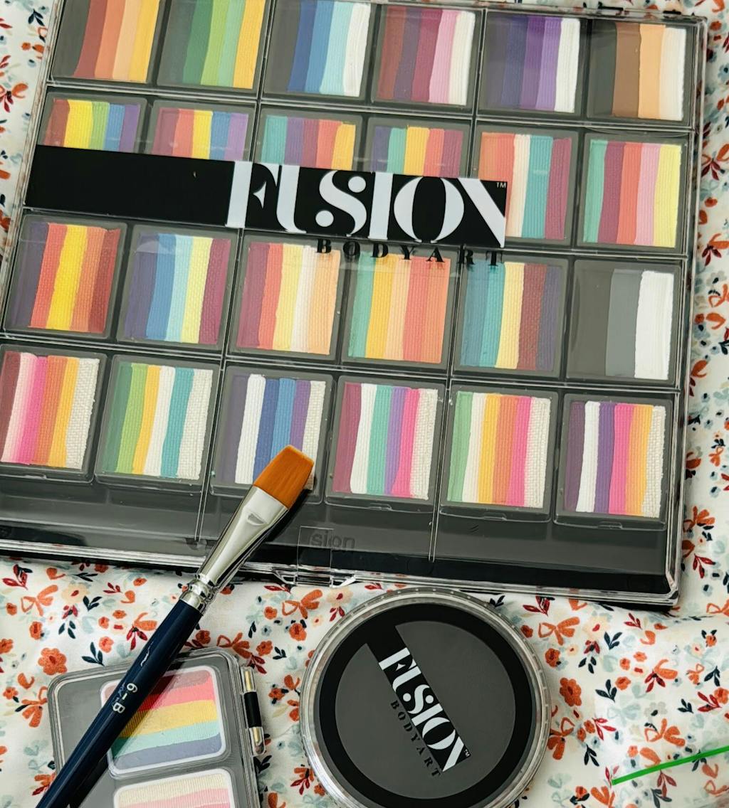 Fusion Body Art Face Paint is fast and easy to apply with a wet paint brush or sponge. Fusion Face Paints can be easily removed with soap and water loaded onto a soft cloth or sponge. Fusion Body Art Face paint colours contain only high-quality FDA and EU compliant skin safe pigments and ingredients that are gentle on the skin. Each colour has been carefully developed to give you the brightest and most opaque colors for your makeup designs. Fusion Body Art Face Paints dry quickly, and once dry have a smudge resistant finish. You can layer colours on top of each other once the base colour is dry, and you can blend Fusion Body Art Face Paints while they are still wet to make endless beautiful shades.